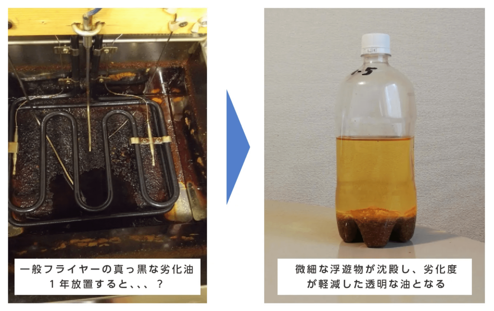 写真(左)は、一般フライヤーで使用済の、真っ黒な劣化油です。このような油を、約1年間放置すると、写真(右)のように、劣化度が低減した透明な油と、黒褐色の沈殿物に分離します。この黒褐色の沈殿物は、揚げカスや不純物が炭化したものであり、油劣化の主な要因となるものです。