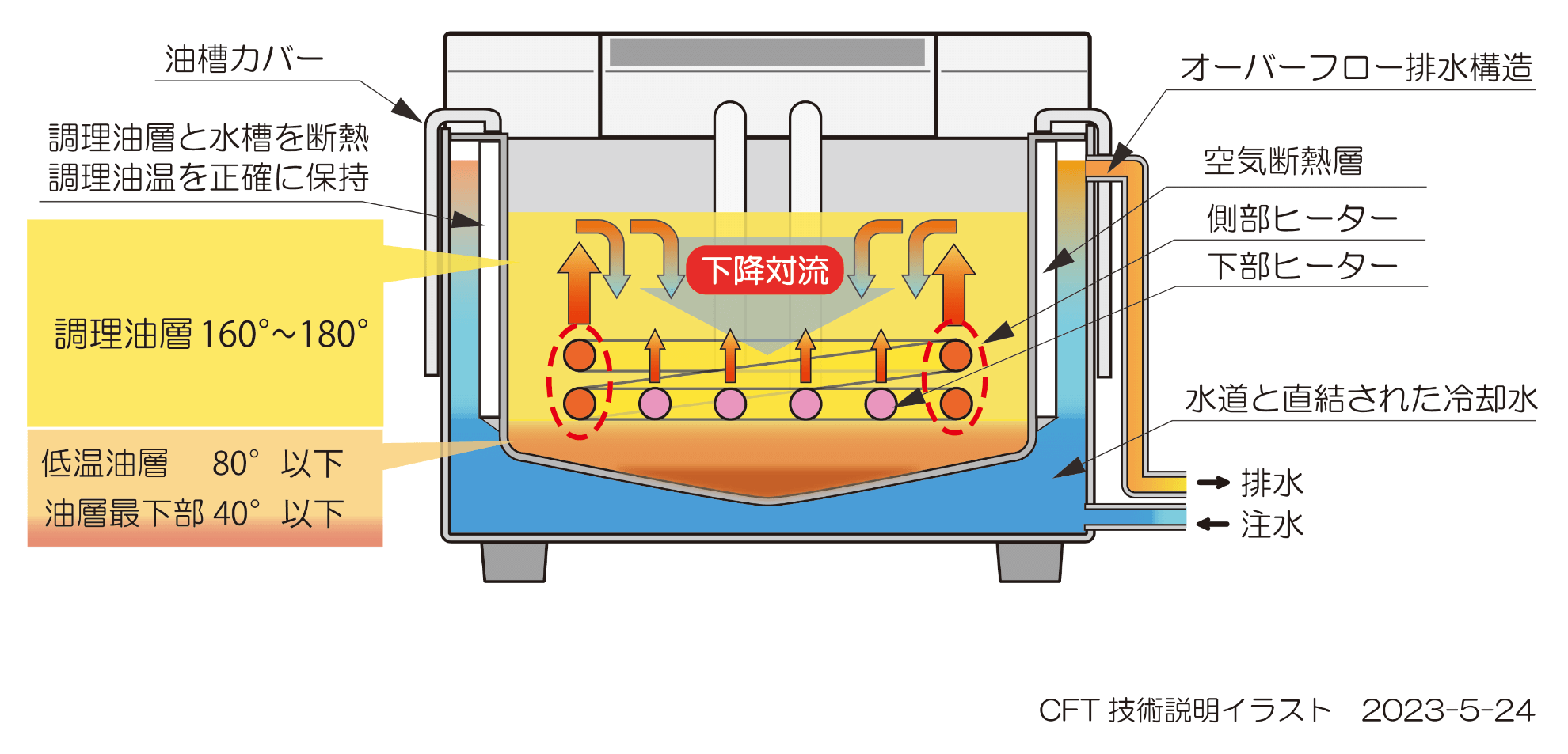 クールフライヤーの構造は、下図のように、油槽の底部を水で覆い、ヒーター直下の油(低温油槽)を水冷する仕組みになっています。これにより、調理中に発生した水分や微細な揚げカスを低温である底部にすばやく落下沈殿させることが可能です。(特許取得済)